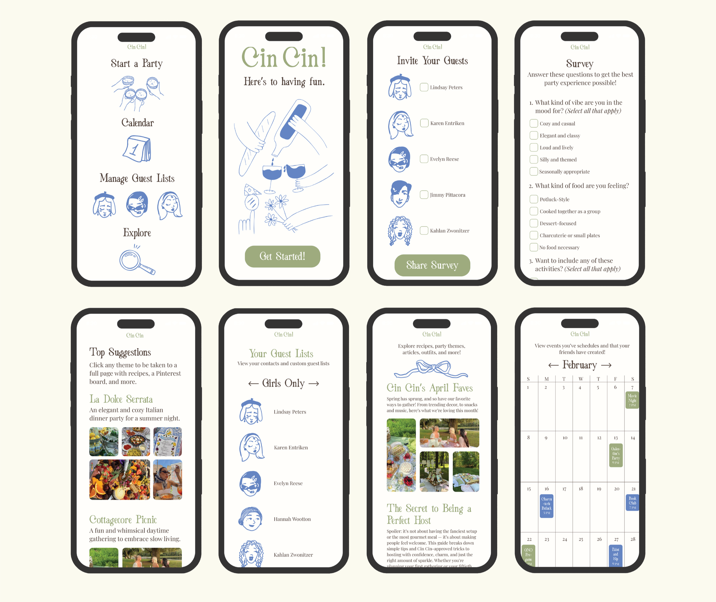 Cin Cin! is a party planning app that helps friend groups easily decide on the perfect gathering theme. By collecting everyone’s preferences through a quick, fun survey, Cin Cin! suggests curated themes complete with a Pinterest board full of menu ideas, decor, music, outfits, and more. It takes the stress out of planning and turns it into something collaborative, creative, and fun — so every get-together feels effortless and everyone feels included.